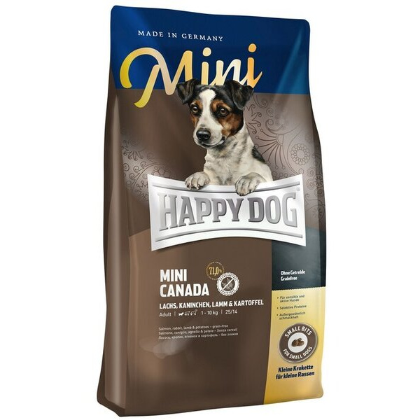 Диета без зърнени храни е най-добрият избор за чувствителни кучета. Happy Dog Mini Канада е разработен специално за активни възрастни кучета от дребни породи. Също така е идеален за чувствителни млади кучета от дребни породи от 8 месеца. Изключително вкусна супер премиум пълноценна храна Mini Канада се приготвя с най-качествено месо от сьомга, вкусен заек и агне плюс безглутенови картофи. Усъвършенствахме тази изключителна рецепта с уникалния Happy Dog Life Natural Concept® от натурални съставки.