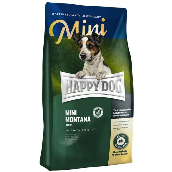 Особено вкусна, лесно смилаема гранулирана храна за кучета от малки породи.   Със своята деликатна и изключителна рецепта, изработена от конско месо и картофи, супер премиум храна за кучета Happy Dog Mini Montana е идеален не само за кучетата от малки породи, но и за чувствителни кучета с деликатни кореми. Със своя необичаен източник на протеини, тази суха храна е идеална за кучета с непоносимост към определени храни, както се препоръчва от ветеринарите. Рецептата без зърно и без глутен е лесна за усвояване и пълно усещане за вкус.   Малките бисквити са създадени специално за малки породи кучета, за да могат по-лесно да дъвчат и да усвояват тази вкусна пълноценна храна. Те са идеалният избор за малките гастрономи. Омега 3 и омега 6 мастни киселини осигуряват здрава кожа и лъскава козина. Happy Dog Mini Montana е идеален за възрастни кучета от малки породи до 10 кг.   Картофи, конско 17,5%,картофен протеин, слънчогледово масло, цвеклова пулпа, хидролизиран черен дроб, масло от рапица, ябълкова пулпа 1,3%, натриев хлорид, екстракт мая.   Аналитичен състав: суров протеин 24%, сурови мазнини 12%, влакнини 2,5%, пепел 10%, калций 1,6%, фосфор 1,2%, натрий 0,4%, калий 0,8%, магнезий 0,1%, омега – 6 –ненаситени киселини 5%, омега – 3- ненаситени киселини 0,6%.   Добавки/витамини/кг: вит.А 1200МЕ, витамин D3 1200МЕ, таурин 500мг.   Микроелементи: желязо (железен II сулфат, монохидрат) 130мг, мед (меден II сулфат, пентахидрат) 13мг, цинк(цинков оксид) 110мг, калиев перманганат (оксид II) 16мг, йод (сух йодат DL- метионин) 3200мг.   Аминокиселини/кг: DL метионин 3200мг.   Антиоксиданти: екстракти на растителни масла на токоферол.