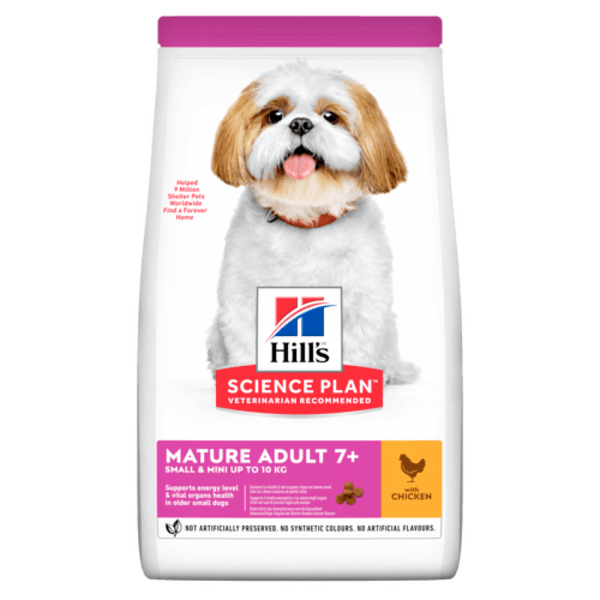 Голяма любов в малка опаковка. Храната Hill’s Science Plan Small & Mini Mature Adult 7+ с пилешко е специална формула, която облекчава процеса на остаряване при кучетата от малки и мини породи (<10кг) в напреднала възраст от 7 до 10кг. Прави се специално с най-малкия размер гранули и синергичен микс от хранителни вещества за енергия и жизненост. Без добавени изкуствени консерванти, овкусители и оцветители. (Пиле 8%; общо птичи продукти 13%).