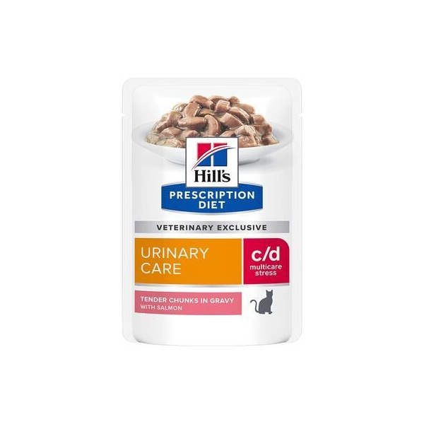 Hill’s Prescription Diet c/d Multicare Stress Urinary Care е диетична консервирана храна, която е може да подпомогне функцията на пикочните пътища на вашия домашен тигър.Съдържанието на магнезий, калций и витамин D в нея е намалено, а освен това тя притежава и алкализиращи урината качества. Това може да спомогне за създаването на среда в урината, неподходяща за образуване на пикочни камъни. Освен това котешката храна Hill’s Prescription Diet c/d Multicare Stress Urinary Care със сьомга се отличава и с уриноразреждащи качества по отношение на струвитните камъни, а това може да спомогне за намаляване на риска от образуване на нови струвитни камъни.Hill’s Prescription Diet c/d Multicare Stress Urinary Care със сьомга, накратко: