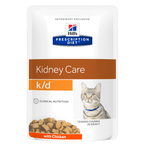 Грижа за бъбреците Бъбреците филтрират отпадъците и токсините от кръвта и поддържат нормалния баланс на течности и минерали в тялото. Тъй като домашните любимци остаряват, може да настъпи увреждане на бъбречните тъкани. Този процес е необратим и води до загуба на бъбречната функция. Котките с намалена бъбречна функция могат да изпитат загуба на апетит и техният прием на храна може да намалее, което може да доведе до загуба на мускулна маса. Специалистите по хранене и ветеринарните лекари са разработили лечебно хранене, за да поддържат функцията на бъбреците на котката и да поддържат мускулната маса. В действителност, храненето на k/d клинично доказано подобрява и удължава качеството на живот. Как работи: Prescription Diet™ k/d™ Feline клинично доказано помага за удължаване и силно подобряване на качеството на живот при котки с бъбречни нарушенияОсновни характеристики Контролирани нива на фосфор и ниско съдържание на натрий за подпомагане на бъбречната и сърдечната функция. С технология за засилване на апетита – Enhanced Appetite Trigger (E.A.T.) ™, която стимулира апетита на котки с бъбречни заболявания, до 35% по-голям прием на калории в сравнение с други храни, подходящи при бъбречни нарушения на пазара. С подобрен профил и високи нива на аминокиселините (градивни елементи на мускулите), за да поддържа естествената способност на котката да изгражда мускулна маса. Терапевтични нива на L-карнитин и Омега-3 мастни киселини. Предлага се под формата на суха храна, консерви и паучове с различен вкус, за още по-голямо удоволствие на Вашата котка. Как помага: Предпазва жизнената функция на бъбреците и сърцето. Поддържа естествената способност на котката ежедневно да изгражда мускулна маса. Стимулира апетита и увеличава приема на калории. S+OXSHIELDTM: Формулирана за насърчаване на здравословна уринарна среда, като намалява риска от развитие на струвитни и калциево-оксалатни кристали. Допълнителна информация: Prescription Diet™ k/d™ Feline клинично доказано помага за удължаване и силно подобряване на качеството на живот при котки с бъбречни нарушения. Моля, консултирайте се с Вашия ветеринарен лекар за повече информация как нашите лечебни храни могат да помогнат на котката да продължи да се радва на щастлив и активен живот.