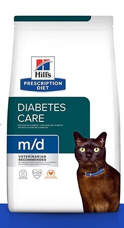 Prescription Diet™ Feline m/d™ е пълноценна суха диетична храна за котки за регулиране на приема на глюкоза при захарен диабет. За намаляване на наднорменото телесно тегло. С ниско ниво на бързоусвоими въглехидрати. Ниско енергийно съдържание.