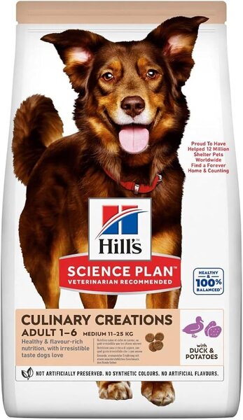 Hill's Science Plan CULINARY CREATIONS за зрели кучета е храна, създадена с патешко и картофи, формулирана така, че да осигури вкусно изживяване за кучетата.