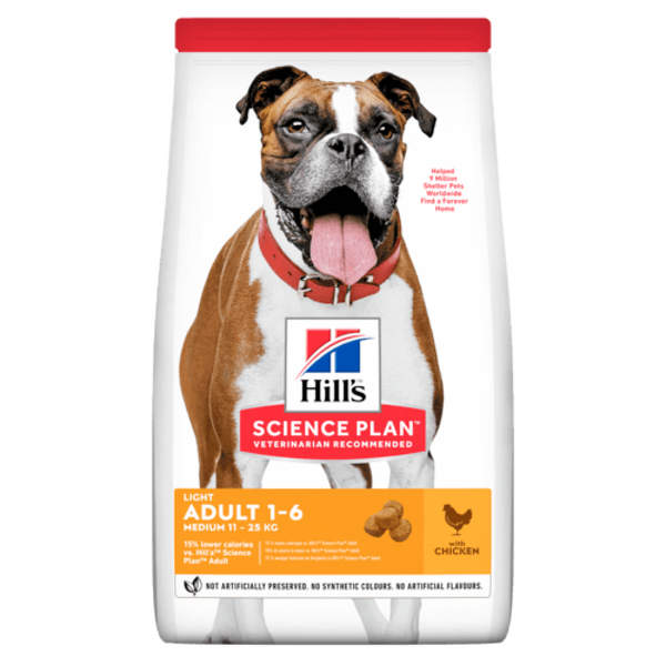 Храната Hill’s Science Plan Light Medium Adult е пълноценна нискокалорична храна за кучета от средните породи (11-25кг) от 1 до 6 години, с тенденция за натрупване на наднормено тегло.