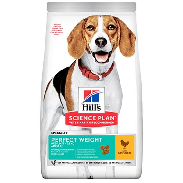 HILL'S SCIENCE PLAN Perfect Weight MediumAdult е пълноценнахрана с пилешко за кучета от средните породи (10-25кг) над 1год., с наднормено тегло или с тенденция за натрупване на тегло. Клинично доказано хранене за достигане и поддържане на здравословно тегло. Високопротеинова, богата на фибри формула, обогатена с L-карнитин и кокосово масло за поддържане на метаболизма.