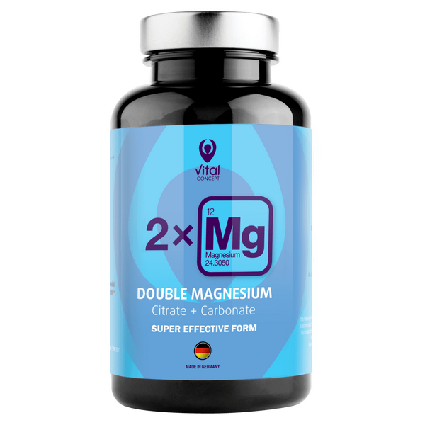 DOUBLE MAGNESIUM е иновативен немски продукт, създаден с цел да осигури максимално ефективен прием на един от най-важните за тялото минерали - магнезий. Магнезият е важен минерал, който участва в повече от 300 процеса в човешкото тяло, активира над 300 ензима и спомага за намаляването на мускулните спазми и крампи. DOUBLE MAGNEISUM (Двоен магнезий) съдържа две от органичните форми на магнезиеви съединения: магнезиев цитрат и магнезиев карбонат. В сравнение с най-масово разпространения на пазара магнезиев оксид, цитратът е в пъти по-ефективен и по-лесно усвоим от тялото. Почти не може да се предозира, защото тялото саморегулира усвояването ѝ - ако нивата на магнезий са прекалено високи, по-малко ще се усвоява от тънките черва и обратното.