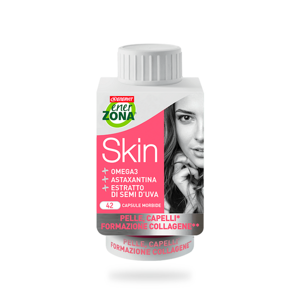 EnerZona Skin е съюзникът, на който могат да разчитат всички жени, които търсят продукт, който да се грижи за кожата и косата. EnerZona Skin е подходящ за: - Млади жени, които търсят продукт за подобряване на хидратацията и яркостта на кожата - Възрастни жени, които трябва да подобрят тонуса и цвета на кожата - Всички жени, които искат да си възвърнат силната и лъскава коса Кожата е огледалото на душата. Но също и от смог, стрес, лоша диета. Резултатът? Кожата е скучна, тънка и косата губи блясъка си. За да поддържаме кожата и косата здрави, пристигна следното: Кожа. Тайна е? Това е перфектната комбинация между: Омега 3 мастните киселини се определят като основни, тъй като тялото ни не е в състояние да ги произвежда самостоятелно, но те помагат да се получат значителни ползи за тялото. Витамин Ц - Допринася за физиологичното образуване на колаген за нормалната функция на кожата. Астаксантин - интензивен червен каротиноид, извлечен от едноклетъчни сладководни водорасли. Екстракт от гроздови семки - Той допринася за физиологичната антиоксидантна функция и за функционалността на микроциркулацията. Биотинът помага да се поддържат кожата и косата здрави. Начин на употреба Препоръчва се прием на две капсули на ден, след закуска или в края на обяда, в продължение на поне 3 седмици. Ако е необходимо, повторете цикъла. Предупреждения Не превишавайте препоръчителната дневна доза. Съхранявайте на място недостъпно за деца под тригодишна възраст. Добавките не са предназначени като заместител на разнообразното хранене. Продуктът трябва да се използва като част от разнообразна и балансирана диета и здравословен начин на живот. Съставки Рибено масло, стандартизирано до 75% в омега 3 - Желатинова капсула (хранителен желатин, устойчив агент: глицерол, овлажнител: сорбитоли, багрило: железни оксиди и хидроксиди) - Витаминен микс (Витамин С (6-палмитат на L-аскорбил), D- биотин) - Сгъстител: моно и диглицериди на мастни киселини - Растителен екстракт от Vitis Vinifera L., сперма от титла. в проантоцианидини (100%) (3,3%) - Олеорезин от домат (тит. 6% в ликопен, 0,75% във фитоен, 0,5% във фитофлуен) (3,3%) - Слънчогледово масло с високо съдържание на олеинова киселина - Капсулна обвивка (средна верижни триглицериди, остъкляващи агенти: етилцелулоза, амониев хидроксид, мастни киселини, натриев алгинат) - Лутеин от Tagetes Erecta (0,17%) - Астаксантин от Haematococcus Pluvialis (0,03%) - Зеаксантин от Tagetes Erecta (0,03%) - Емулгатор. Разфасовка 42 капсули, 63 g