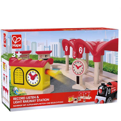 Дървен железопътен комплект, Hape, Запиши, чуй и освети жп гара