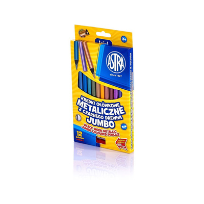 Комплект цветни моливи, Astra, Jumbo, Метални триъгълни от черна дървесина, 12 цвята с острилка