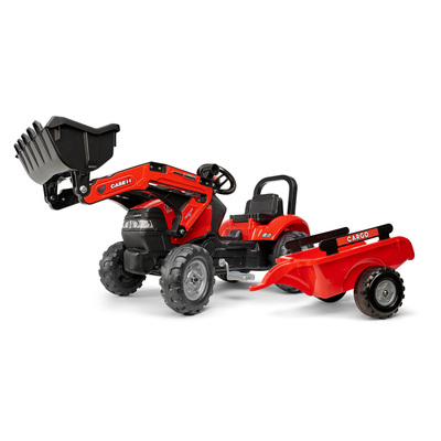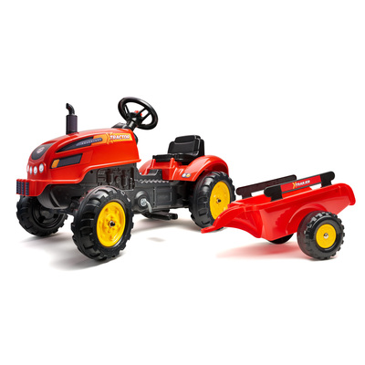 Детски трактор с ремарке, отварящ се капак и педали - червен