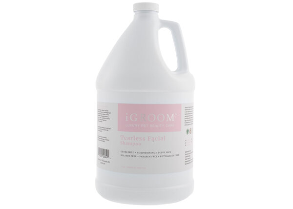 iGroom Tearless Facial Shampoo (3.78 L) е ултра-нежен, безсълзен шампоан, специално създаден за измиване на лицето и деликатните зони около очите и муцуната. Ефективно премахва замърсявания, без да дразни или парене.
