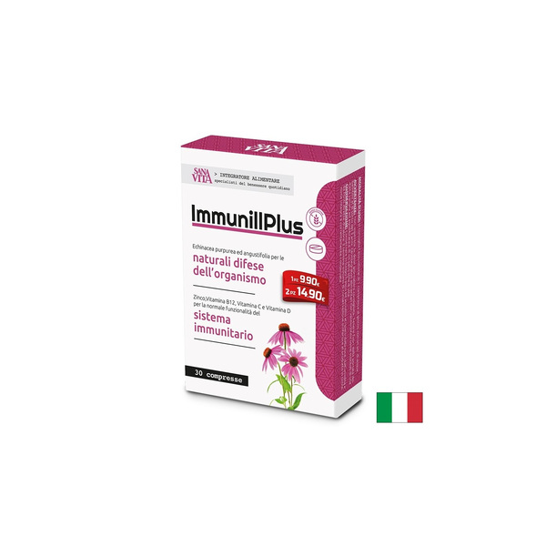Sanavita ImmunillPlus - ИмунПлюс (с ехинацея, Витамин С, В12, D3 и цинк) е хранителна добавка, съдържаща комбинация от растителни екстракти, витамини и минерали в подкрепа нормалното състояние на имунната система. Оказва имуностимулиращо, противовирусно, антибактериално и противовъзпалително действие, спомага за скъсяване периода на боледуване при грип, простуда и настинка и допринася за ускоряване на възстановяването. Укрепва имунната система и повишава защитните сили на организма. Оказва благоприятен ефект при респираторни инфекции, заболявания на горните дихателни пътища и грипоподобни състояния. Има общоукрепващо действие и осигурява антиоксидантна защита на организма.