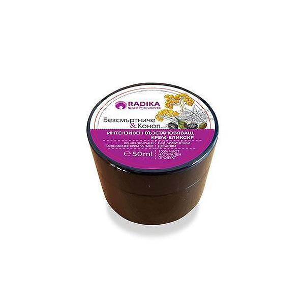Крем-еликсирът е обогатен със 100% натурални съставки. Безсмъртничето е лечебно растение, известно и с името си „Билка на красотата”. Силата му е съчетана с тази на конопеното масло.