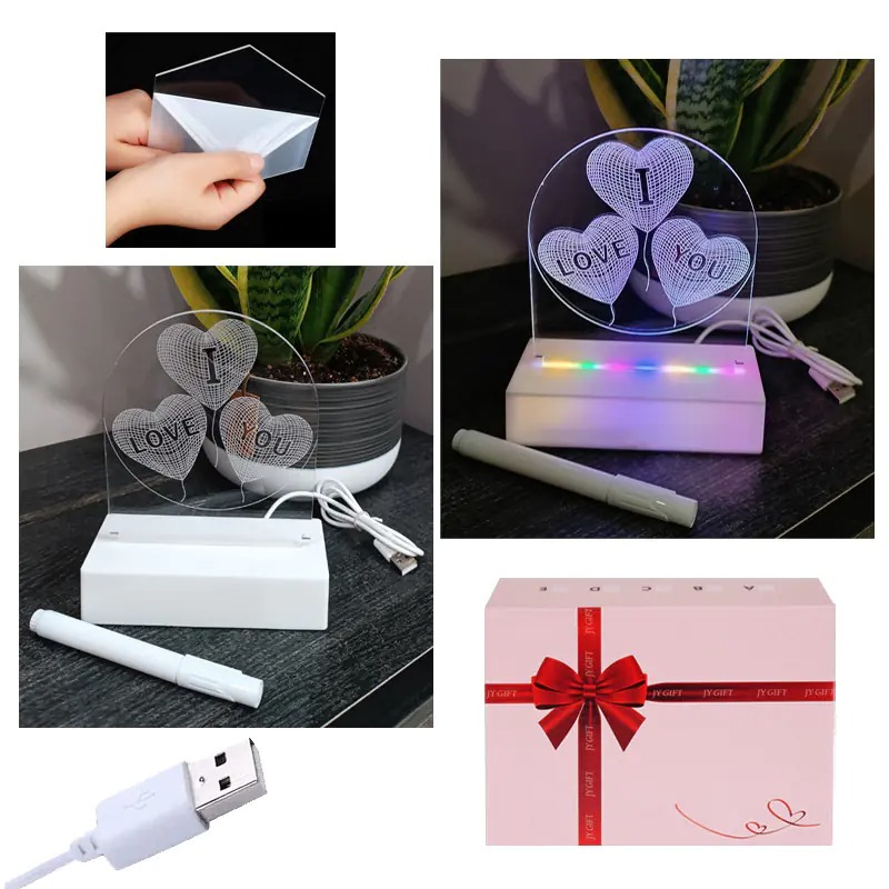 Интериорна 3D - LED настолна лампа работи с USB кабел или батерии /не са включени в комплекта/. Отлепете защитното фолио преди да напишете своето послание с помощта на белия маркер /почиства се лесно с мека кърпа/.