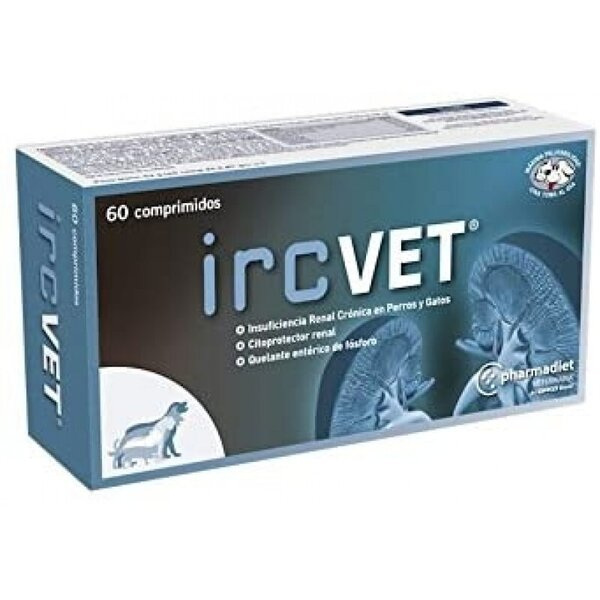 Изключително важно е навременното диагностициране на бъбречната недостатъчност далеч преди появата на клинични признаци (слабеене, капризен апетит, повръщане, лош дъх и др.) – за целта препоръчваме на всички пациенти над 6- годишна възраст (а при предразположените породи още след едногодишна възраст) веднъж годишно изследване на кръвния показател SDMI. ИркВет се предлага под формата на таблетки и орален гел.IrcVET 60 таблетки, с подпомагащ бъбречната функция, протектиращ бъбречните клетки и ентерално свързващ фосфора ефект,оказващ синергично действие и с тези на Ипакитин и Рубенал.Състав: кверцетин, хидролизиран пилешки протеин, картофено брашно, магнезиев стеарат, кристобалит, алуминиев хидроксид,екстракт от Polygonum cuspidatum, съдържащ ресвератрол; витамини, про-витамини и химически добре дефинирани субстанции с подобен ефект – виж таблицата на картонената кутия.