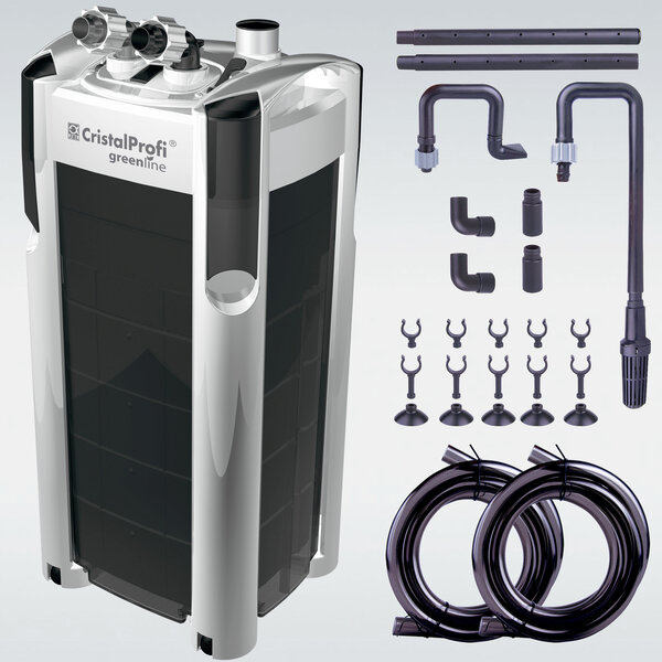 Съдържание на пакета: външен филтърен модул за аквариуми, вкл. маркучи и тръби 19/27 mm, всмукателен филтър, коляно, вендузи, филтърна среда (биофилтърни топки и биофилтърна пяна)