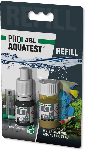 Тестът JBL K Kalium Test може да бъде използван за измерване и рутинен контрол на калия в сладководни аквариуми в граници от 2 до 15 мг/л (ppm). Солената вода има концентрация на калия около 390-400 мг/л, който се консумира в малки количества. Много висока концентрация на калий може да бъде опасна за чувствителни животни като скаридите.