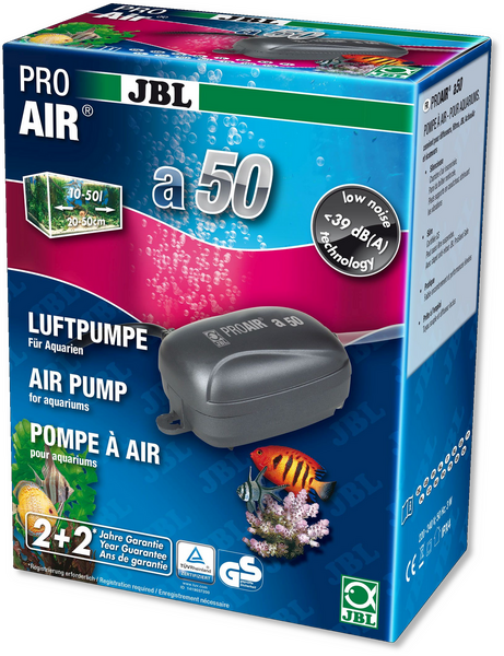 За надеждно снабдяване с кислород в аквариуми: готова за инсталиране диафрагмена помпа с възвратен клапан и въздушен камък - 50 l/h изходен въздух, > 160 mbar налягане на главата, 2,3 W консумация на енергия