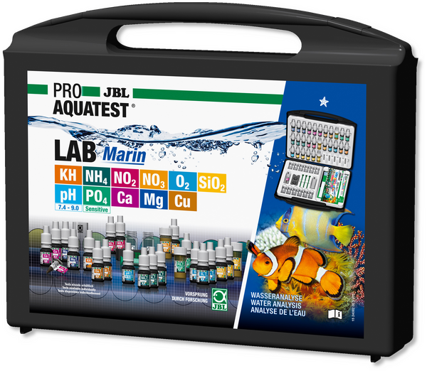 Наблюдава лесно и надеждно стойностите на водата в морските аквариуми. Определя: pH стойност, карбонатна твърдост, калций, магнезий, мед, амоний, нитрит, нитрат, фосфат, силикат, кислород
