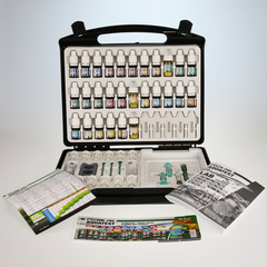 Съдържание на опаковката: 1 тестова кутия, вкл. 29 реагента, 12 стъклени флакона, 2 пластмасови кювети, 2 спринцовки, 3 мерителни лъжички, термометър, химикалка, отчетни листове и лист за анализ, лабораторна система за сравнение и подробни инструкции за употреба