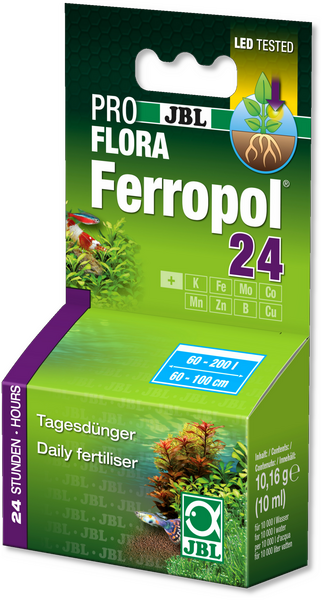 Хранене за аквариумни растения:Здравите растения предотвратяват растежа на водораслите, доставят кислород, премахват замърсителите, осигуряват скривалища и намаляват патогените.Здрави растения = здрави риби:За да процъфтяват растенията, трябва да бъдат изпълнени следните изисквания:светлина (осигурява източник на енергия за фотосинтеза на CO2), хранителни вещества и микроелементи (действат като стимулатори на растежа).JBL торовете доставят на растенията всички основни хранителни вещества и основни микроелементи. По този начин растенията могат да абсорбират всички необходими хранителни вещества, от които се нуждаят, през листата и корените и по този начин се предотвратяват симптомите на дефицит (напр. недостиг на желязо).Не се обърквайте: етикетът казва "...комплексна стабилност при pH 4-5." Това означава, че JBL Ferropol има pH стойност 4-5. Това е необходимо, за да се запази зеленикавият цвят (комплекс от цветове) стабилен и няма нищо общо с това дали е ефективен при тази стойност на pH. JBL Ferropol може да се използва при всички стойности на pH и наличността на съдържащите се минерали се увеличава с увеличаване на стойността на pH.