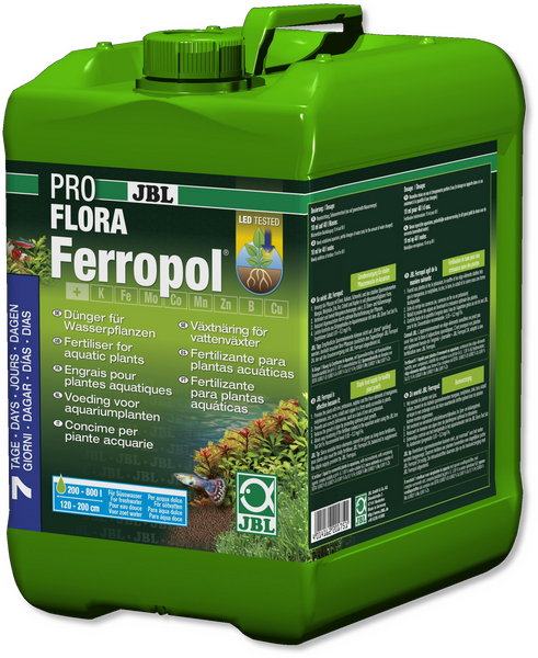 Хранене за аквариумни растения:Здравите растения предотвратяват растежа на водораслите, доставят кислород, премахват замърсителите, осигуряват скривалища и намаляват патогените.Здрави растения = здрави риби:За да процъфтяват растенията, трябва да бъдат изпълнени следните изисквания:светлина (осигурява източник на енергия за фотосинтеза на CO2), хранителни вещества и микроелементи (действат като стимулатори на растежа).JBL торовете доставят на растенията всички основни хранителни вещества и основни микроелементи. По този начин растенията могат да абсорбират всички необходими хранителни вещества, от които се нуждаят, през листата и корените и по този начин се предотвратяват симптомите на дефицит (напр. недостиг на желязо).Не се обърквайте: етикетът казва "...комплексна стабилност при pH 4-5." Това означава, че JBL Ferropol има pH стойност 4-5. Това е необходимо, за да се запази зеленикавият цвят (комплекс от цветове) стабилен и няма нищо общо с това дали е ефективен при тази стойност на pH. JBL Ferropol може да се използва при всички стойности на pH и наличността на съдържащите се минерали се увеличава с увеличаване на стойността на pH.