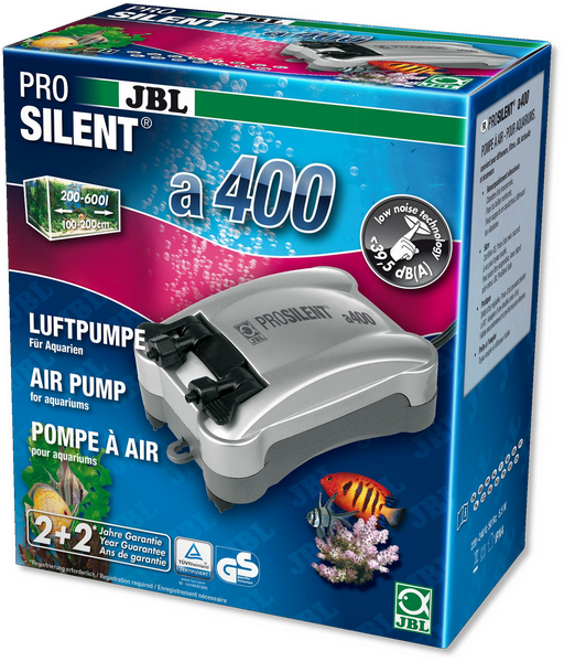 Съдържание на опаковката: въздушна помпа за сладководни и соленоводни аквариуми от 200 до 600 л, Pro Silent a400, вкл. 2 м маркуч за въздух, възвратен клапан, камък за въздух