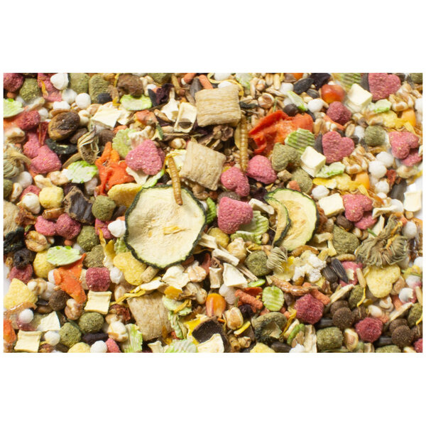 екструдирано царевично брашно, царевични люспи, двуцветно сорго, пшенични люспи, пшеница, бухнала пшеница, мило, слънчогледово семе, екструдирано оризово брашно, царевица, рожков, грахови люспи, моркови 3,4%, екструдирано пшенично брашно, диви семена, сребърно просо, семена от канарческа трева, ларви на hermetia 2,4%, пащърнак 2,1%, овесени ядки, маново просо, елда, цвекло 1,6%, птичи протеин, семена от сминдух, пашкули от копринена буба 0,9%, боб мунг, овесени закуски (зърнени храни (овес 50%), екстракт от растителен протеин, растителен -продукти (ечемичен малц), минерали), брашнени червеи 0,8%, сусамово семе, амарант, син мак, цвят от невен, магданоз, масло от рапица, семена от крак, скариди 0,4%, домати, чушки, тиквички, краставици, люцерна, тимотейка семена от трева, говеждо и свинско брашно, мояве юка 0,2%, телешка мазнина, птича мазнина, калциев карбонат, семена от люцерна, семена от копър, ленено семе, соево брашно, семена от копър, семена от черен кимион