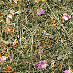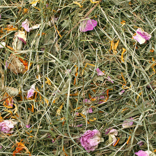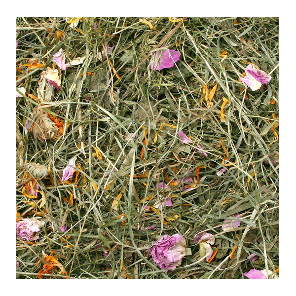 Нежно изсушени треви и билки с много високо съдържание на листа. Обогатен с ароматни летни цветя. Първокласното сено за гастрономите сред гризачите.