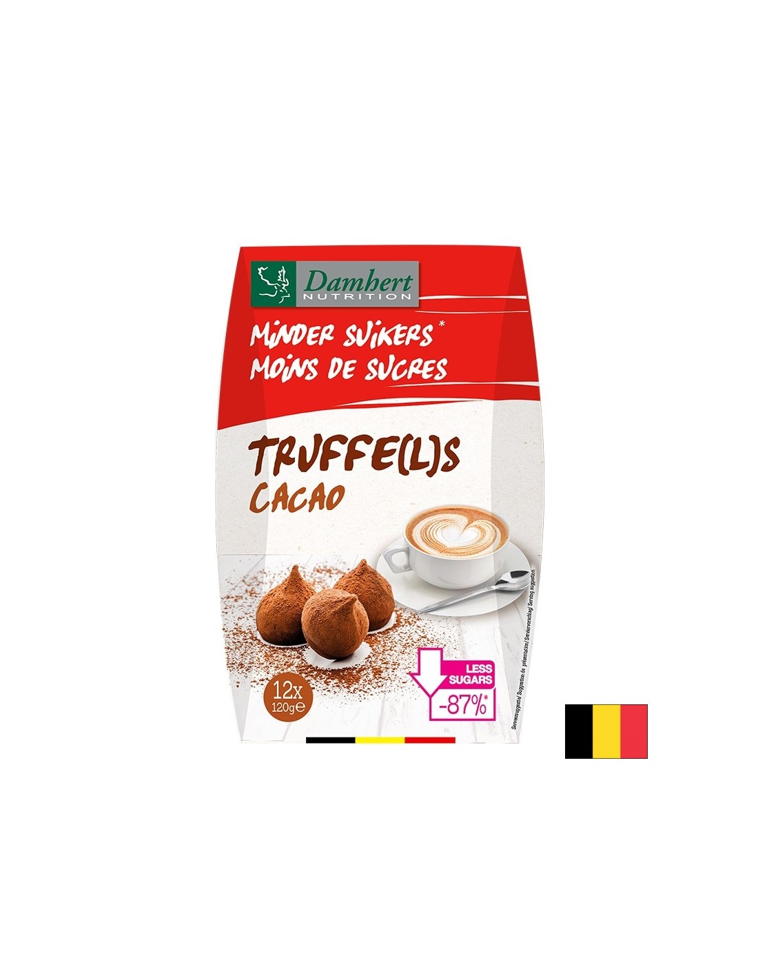 Truffe(l)s Cacao / Какаови трюфели (с ниско съдържание на въглехидрати и захари), 12 броя, 120 грама е здравословен продукт, произведен от белгийската компания Damhert. Тези трюфели са идеални за любителите на шоколад, които търсят здравословна алтернатива, без да правят компромис с неустоимия му вкуса.