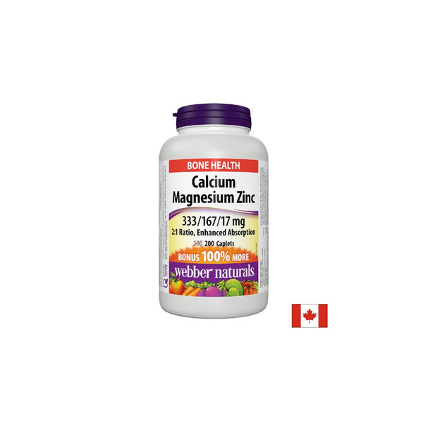 Калций, магнезий и цинк на Webber Naturals ( с повишена абсорбция) е натурална, лесно усвоима добавка, която не само спомага за развитието и поддържането на здрави кости и зъби, но също така стимулира тялото да метаболизира въглехидратите, протеините и мазнините. Минералите позволяват отлична абсорбция, особено за хората с с ниски нива на стомашни киселини.