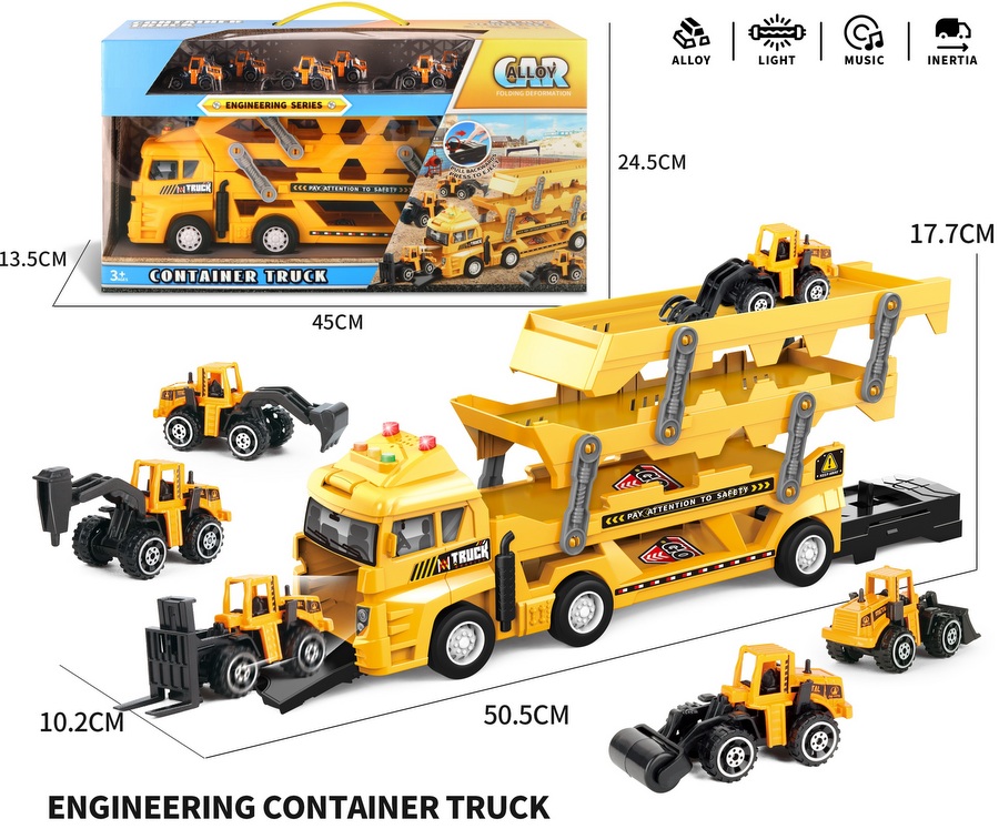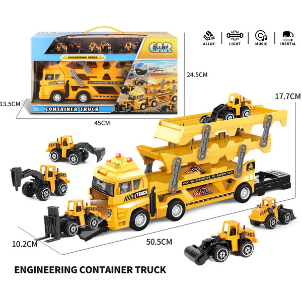 Камион Автовоз с 6 метални машини за строителство светлина и звук за игра е 51х18х10 в кутия е 45х14х25