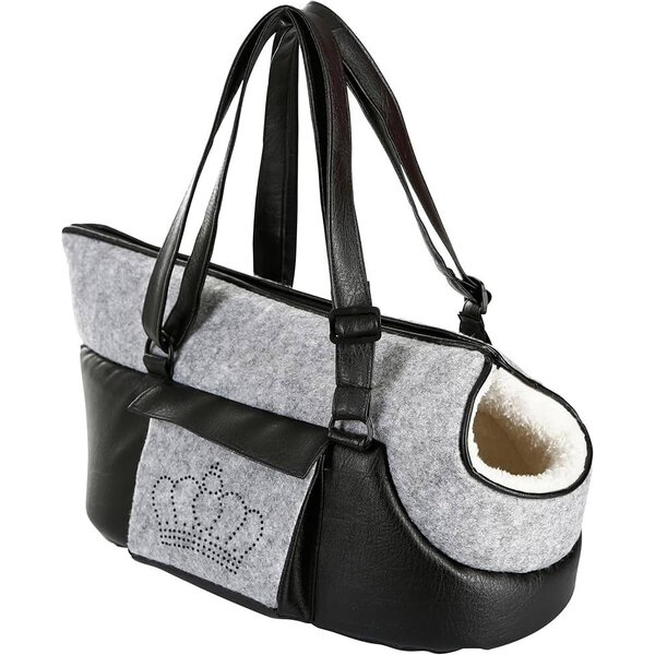 с включен къс повод предотвратяващ изскачането на животното от чантата