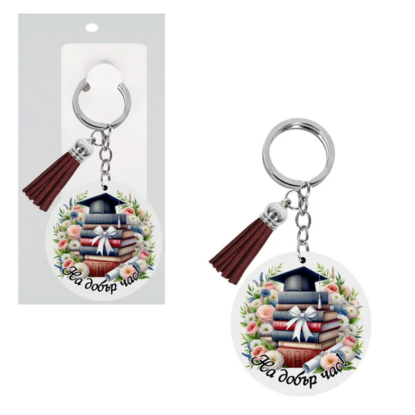 Ключодържател от дърво с кожен тасел - На добър час!