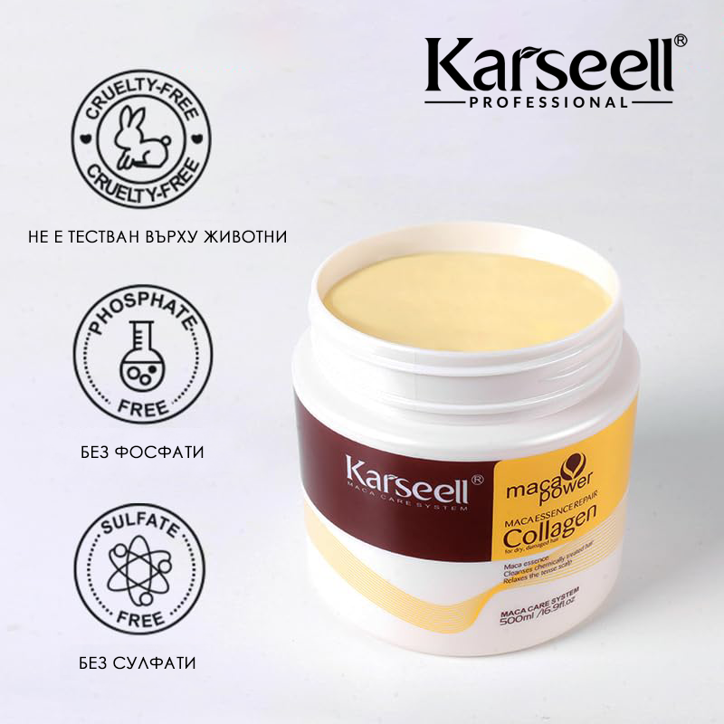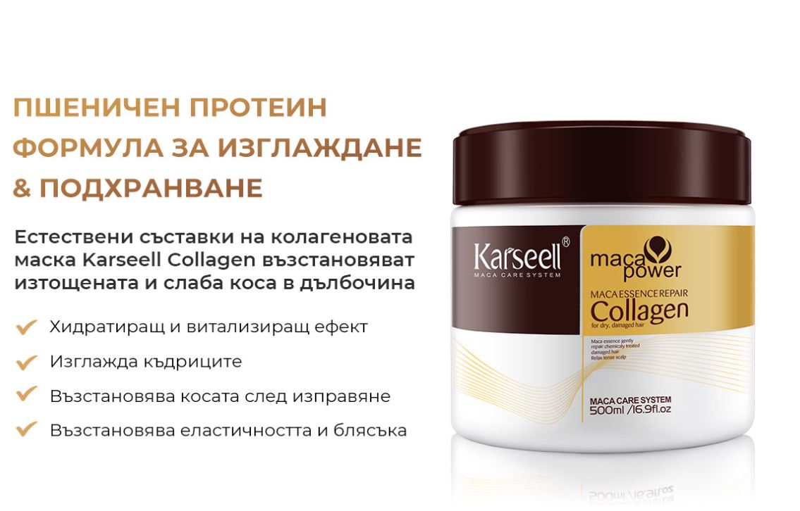 Karseell се превърна в истински хит. Иновативната колагенова маска, съдържаща есенция от мака и патентована технология на Karseell с активен колаген. Доставя енергия на увредената коса и възстановява фибрите на косъма, оставяйки косата хидратирана, гладка и бляскава.