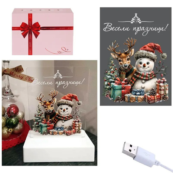 Коледна интериорна 3D - LED настолна лампа "Весели празници!" с USB кабел /пластмаса и плексиглас/.