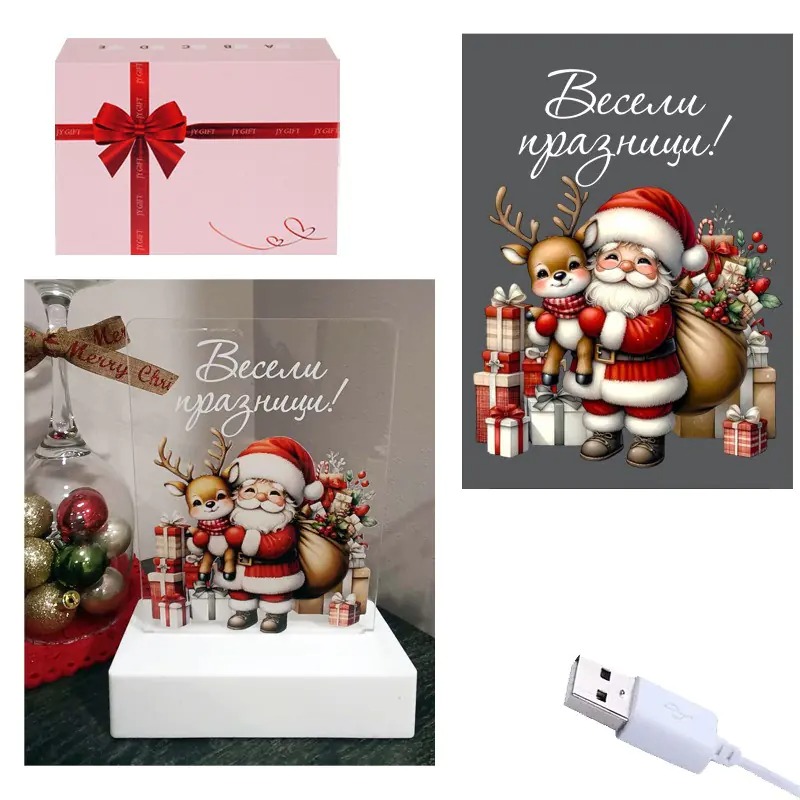 Коледна интериорна 3D - LED настолна лампа "Весели празници!" с USB кабел /пластмаса и плексиглас/.