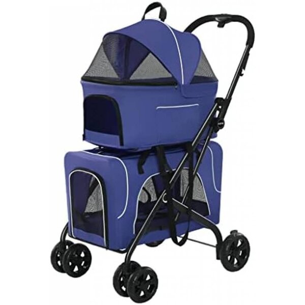 Голям обем на двата коша, така че да има достатъчно място за съхранение, когато пътувате, пазарувате или се разхождате. Може да се използва за повече от един домашен любимец, разделени в двата коша, на две отделни нива. Меката облицовка и удебелените колела с антивибрационна система ще осигурят безопасно и гладко пътуване по всякакви пътища.Може да отворите малката вратичка, след като закопчаете предпазната катарама, и да общувате по-добре с домашните любимци и да изпитате повече забавление.