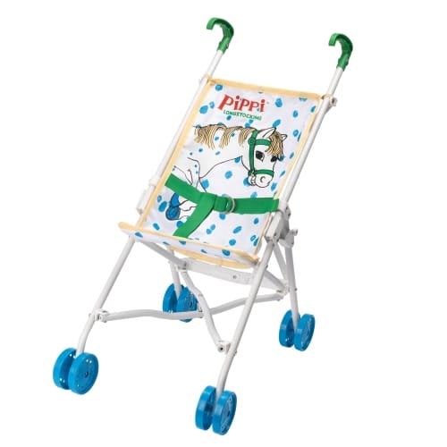 Отидете на приключение с Пипи, нейният кон и любивмата ви кукла! Количката на Pippi е перфектната количка за кукли, която да вземете на път. Илюстрациите на количката за кукли са с верния кон на Пипи, и той също е включен като илюстрация върху плата на количката. Затегнете предпазния колан, за да е готова куклата за разходка навън на слънце!