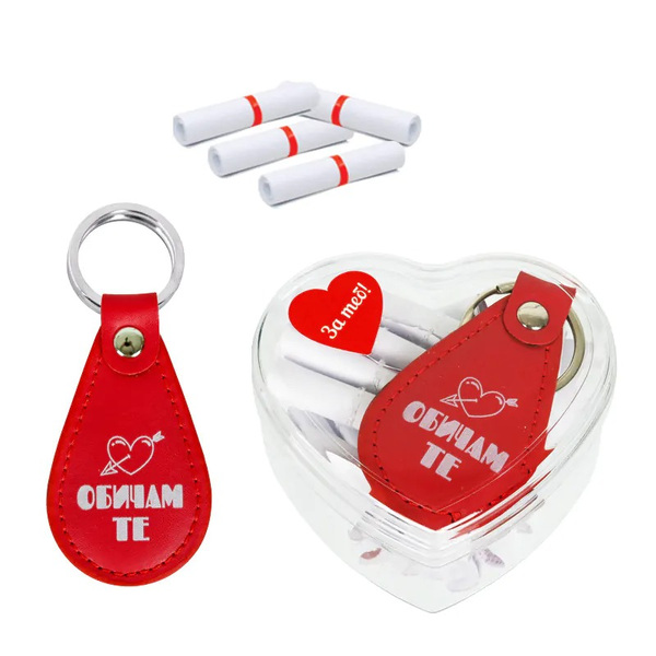 Комплект "20 Причини да те Обичам!" с кожен ключодържател "Обичам те" в кутия сърце /ПВЦ/.