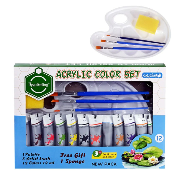 Комплект акрилни бои /12 цвята х 12 мл./ с палитра 3 четки и гъба.