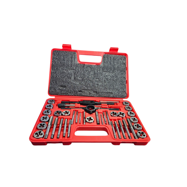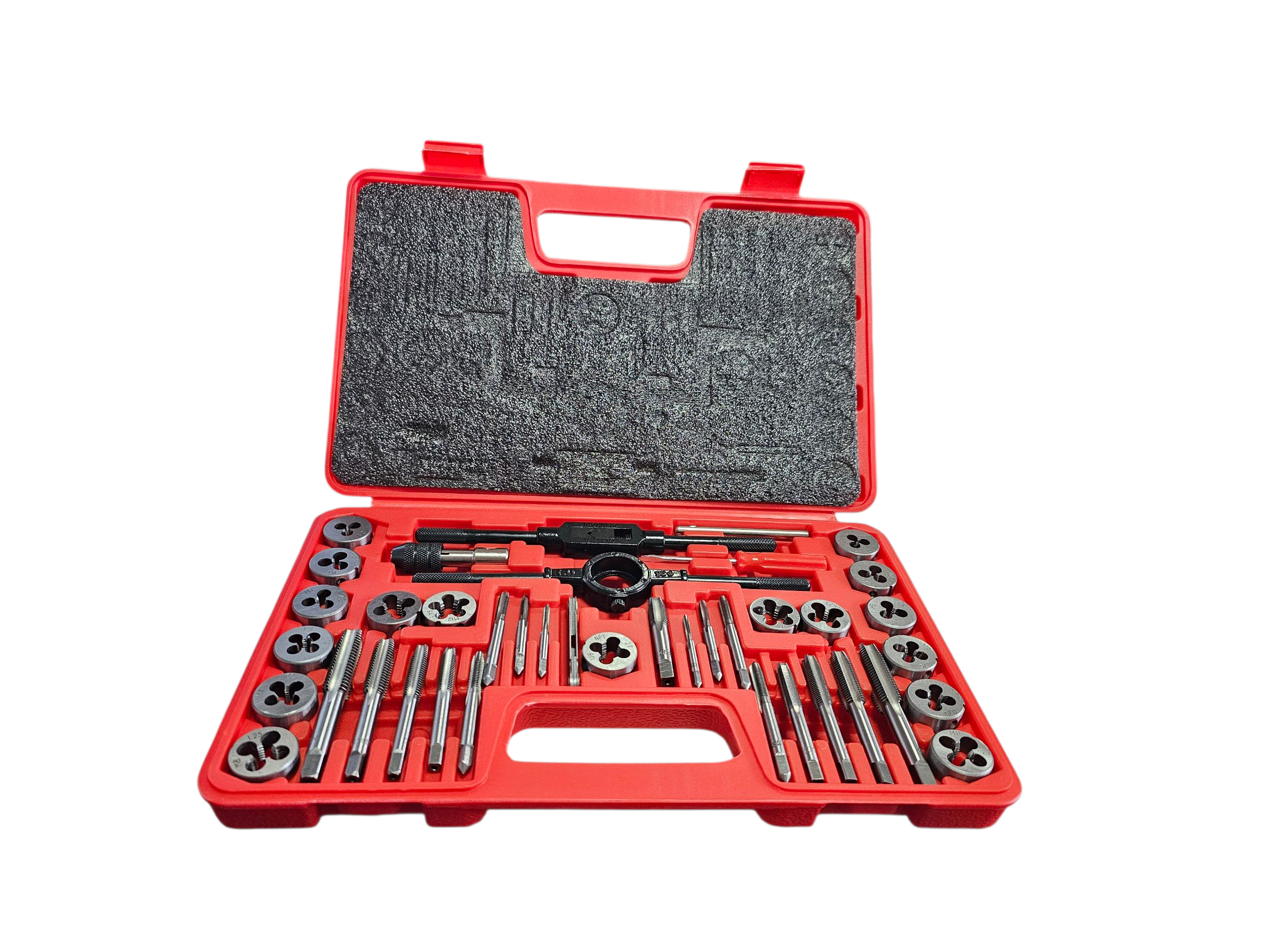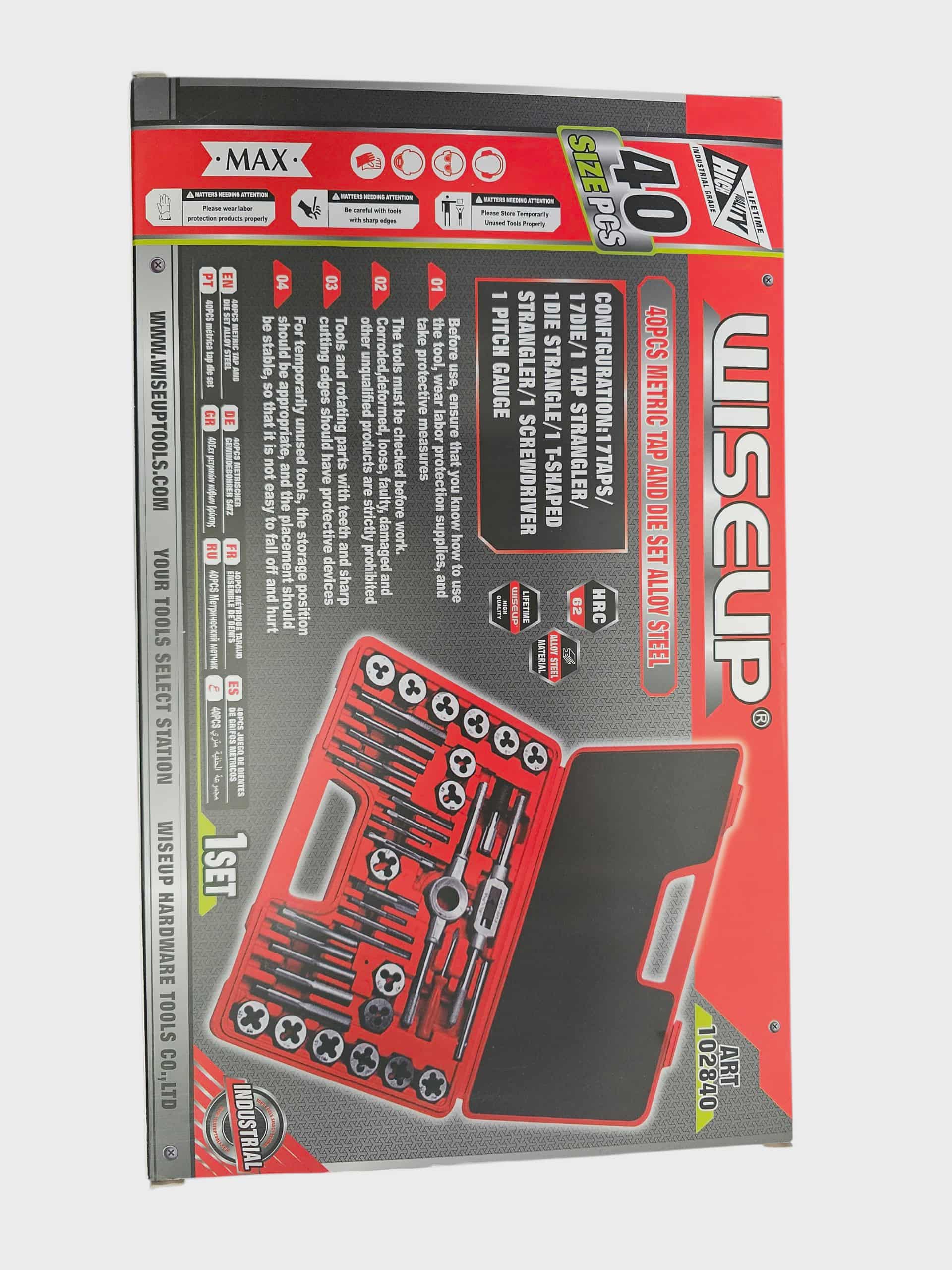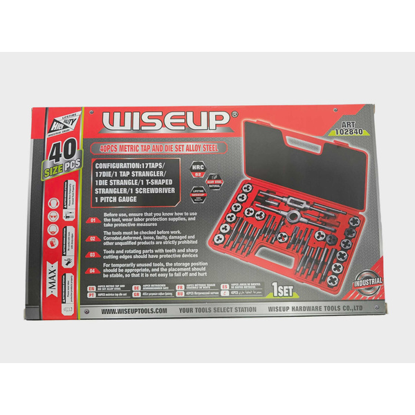 Професионален комплект метчици и плашки WISEUP /40 чати/ - идеалното решение за прецизно нарязване на вътрешни и външни резби. Подходящ за професионална употреба. Изработен от висококачествена легирана стомана /Alloy Steel/, гарантираща издръжливост, твърдост и дълъг живот на инструментите.
