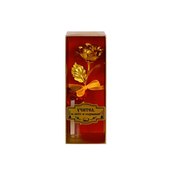 Подаръчен комплект "Учител, на когото се възхищаваме!" със златна роза и послание.