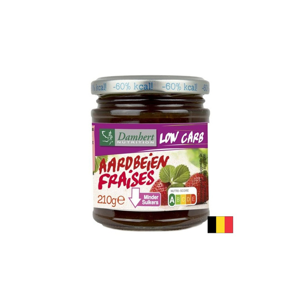 Low Carb Confituur Aardbei / Конфитюр от ягоди с ниско съдържание на захари и въглехидрати, 210 грама е здравословен продукт, произведен от белгийската компания Damhert. Конфитюрът се отличава с високо съдържание на плодове - 50% и минимално количество подсладител под формата на малтитолов сироп.