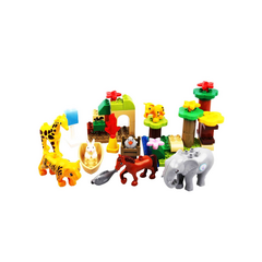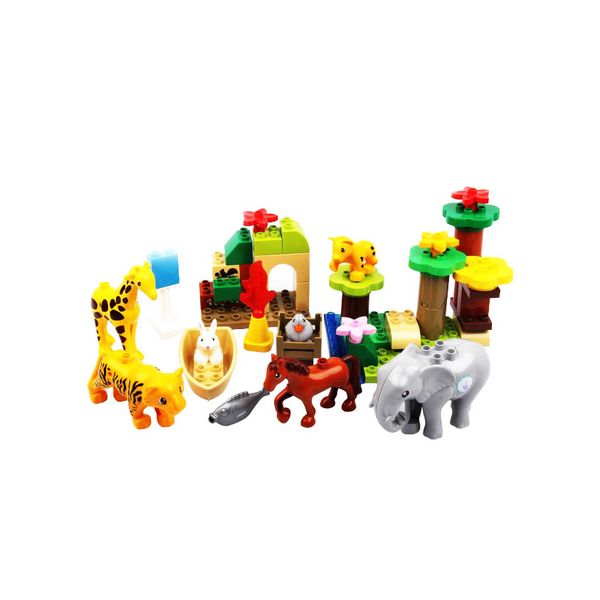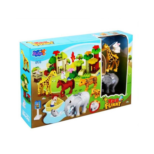 Изключително занимателна игра дори за малките деца. Посредством комплекта те могат да развихрят своето въображение и да строят с часове. Комплектът съдържа 51 пластмасови парчета за създаване на зоологическа градина със слон със звук, жираф, зайче и други и заедно лодка с риби. Работи с 3 батерии тип AG13 (включени).