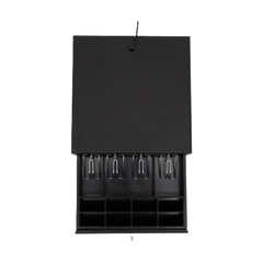 STS-CR330 е идеално решение за търговски обекти с ограничено пространство. Въпреки по-компактните си размери, то предлага гъвкаво вътрешно пространство с 4 отделения за банкноти, които са специално оразмерени за съвместимост с **евро банкноти**. Освен това, разполага с 8 отделения за монети и 2 скрити отделения за съхранение на едри банкноти, ваучери или касови бележки. Механизмът му е тестван за 1 000 000 отваряния, осигурявайки дълъг експлоатационен живот.