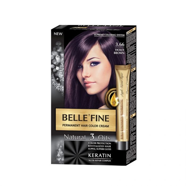 BELLE`FINE - магията на съвършения и абсолютен цвят в съчетание със силна, здрава и обгрижена коса! Съвършен цвят - от корените до краищата! Гладка, заредена с енергия, мека и блестяща коса! Дълготрайна крем-боя за коса с уникална формула, обогатена с Кератин, който прониква дълбоко в структурата на косъма, подхранва, овлажнява и възвръща естествената красота и жизненост на косата. Осигурява перфектно покритие на белите коси и дълготраен резултат! Със съдържание на три натурални масла:Арганово масло - съживява и реконструира косата, като и вдъхва нова сила и жизненост; Маслиново масло - ефективно овлажнява, придава мекота и блясък; Бадемово масло - подхранва косъма, засилва блясъка, гъвкавостта и еластичността на косата. Балсамът за коса съдържа екстракт от Зелен орех (Pro-Structure), който ефективно защитава цвета на боядисаната коса. В рамките на няколко измивания дарявате на косата си дълготраен цвят, сила, еластичност и обем. Кутията съдържа: Туба с боя за коса, 50 мл. Флакон с окислител. Туба с балсам за коса. Чифт защитни ръкавици. Начин на употреба - вижте приложените инструкции. Козметичен продукт за външно приложение. Не е изпробван върху животни. Да се съхранява на места недостъпни за деца!