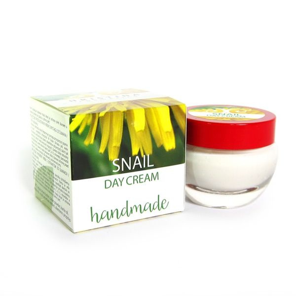 РЪЧНО ПРИГОТВЕН ДНЕВЕН КРЕМ С ЕКСТРАКТ ОТ ОХЛЮВ 100% натурален Уникална формула с какао на прах за лек матиращ ефект, какаово масло за естественна слънце защита и екстракт от секрет на охлюви с изглаждащ, лифтинг ефект за кожата. Предпазва и забавя появата на нежелани бръчки, като изглажда финни скоро появили се такива. За сияйна, защитена и здрава кожа. Нанася се сутрин върху сухо и чисто лице. INCI: AQUA,CACAO BUTTER, CACAO POWDER, KARITE OIL, JOJOBA OIL, SNAIL SECRETION EXTRACT, ALANTOINE, PROPOLYS