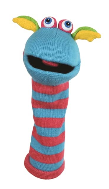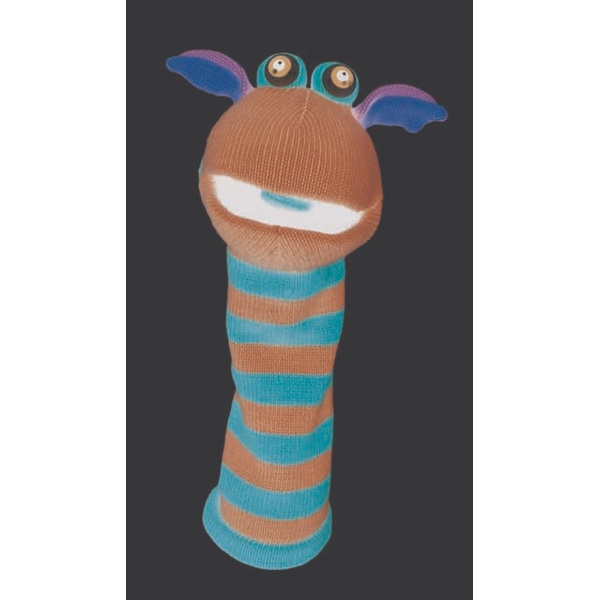 Кукла за куклен театър от серия „Чорапени чудовища“ "Говорещи" чорапени чудовища в блестящи цветове, изработени от висококачествени материали, подходящи за всички възрасти. Куклата отваря и затваря уста. Не издава звуци! Куклата е подходяща за детска ръка и за ръка на възрастен! Играта с кукли за куклен театър развиват мисленето, фантазията, говора, фината моторика, креативността на децата. Те дават възможност за игра и обучение едновременно. Подходящи са, както за детска ръка, така и за ръка на възрастен. Куклите за куклен театър на The puppet Company, са сертифицирирани и отговарят на стандартите за безопасни играчки EN71 и ASTM. Куклата се пере се на ръка, с мек сапун и топла вода, при температура 30 градуса. Оставя се да изсъхне на стайна температура. Не използвайте белина. Да не се глади, да не се пере в перална машина и да не се суши със сешоар. Играчката има пластмасови очички. Материал: плюш, памучен текстил, пластмаса. Не оставяйте детето без родителски контрол преди да сте се уверили, че сте отстранили дребните части и играчката е безопасна! Опаковката не е за игра! Подходяща за деца над 3 години. Размер: 40 см.