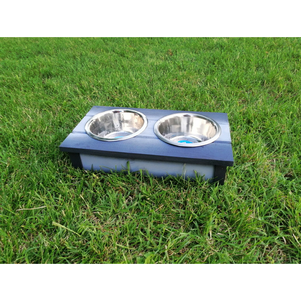 Дървена поставка с две купи за храна и вода.Подходяща за използване на открито и в закрити помещения. В комплект с нашите Приказни къщи или поотделно. Дървената поставка е изработена детайлно с естествени, висококачествени материали, което я прави красива и в същото време здрава. В съчетание с Вашия стил тя може да бъде боядисана с безвредни бои на водна основа, импегнирана или опушена. Металните купи са изработени от неръждаема стомана в разлчни размери.